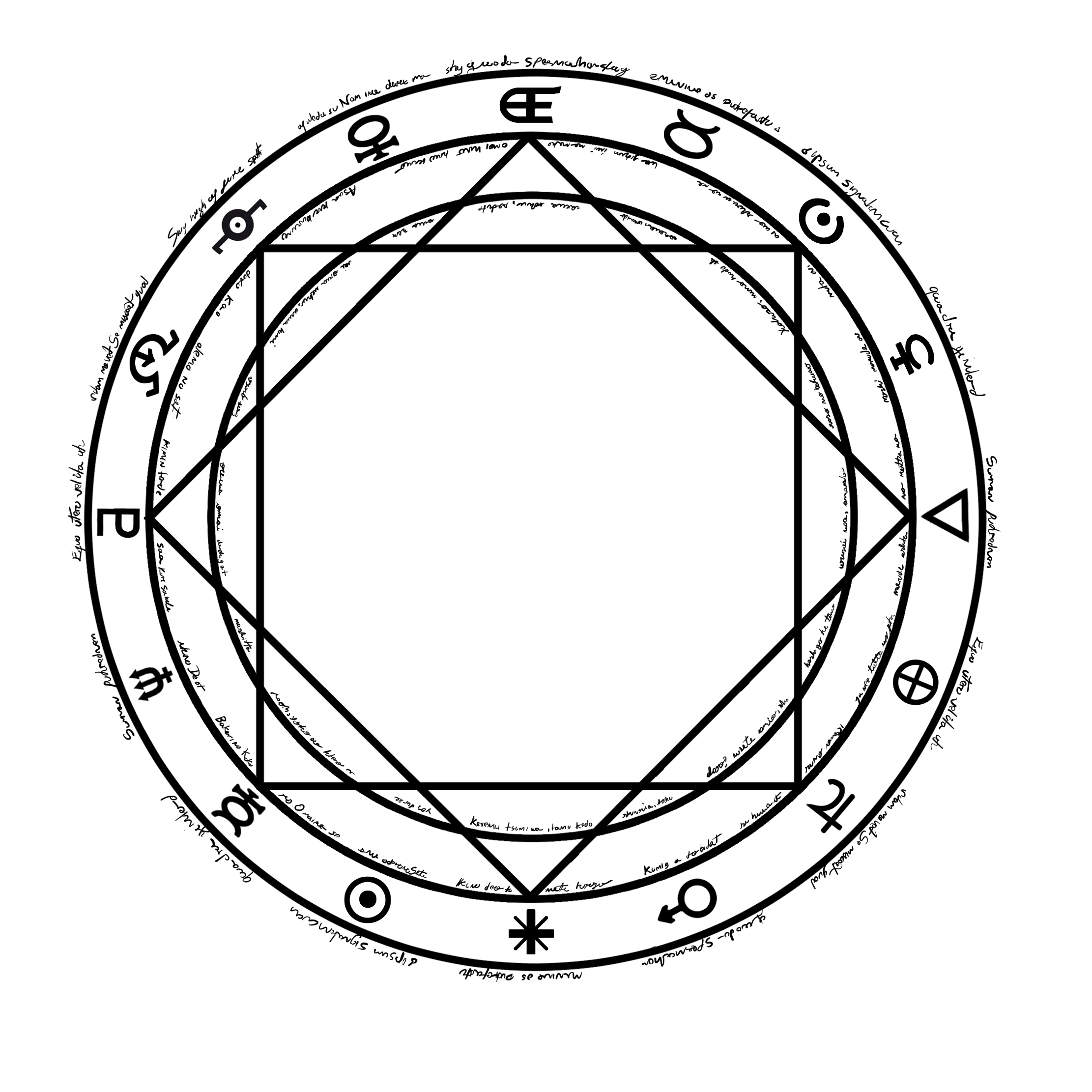 Inside the circle are specific alchemical runes. These runes vary widely based on ancient alchemical studies, texts, and experimentation, but correspond to a different form of energy, allowing the energy that is focused within the circle to be released in the way most conducive to the alchemist's desired effect. In basic alchemy, these runes will often take the form of triangles (which, when positioned differently, can represent the elements of either water, earth, fire or air), but will often be composed of varying polygons built from different triangles. For example, the hexagram is a commonly used base rune in Transmutation Circles because it creates eight multi-directional triangles when inscribed and can, therefore, represent all four classical elements at once. Other, more esoteric runes (including astrological symbols, symbolic images and varying lines of text) are prevalent and represent a multitude of other, specific functions for the alchemical energy that is released.