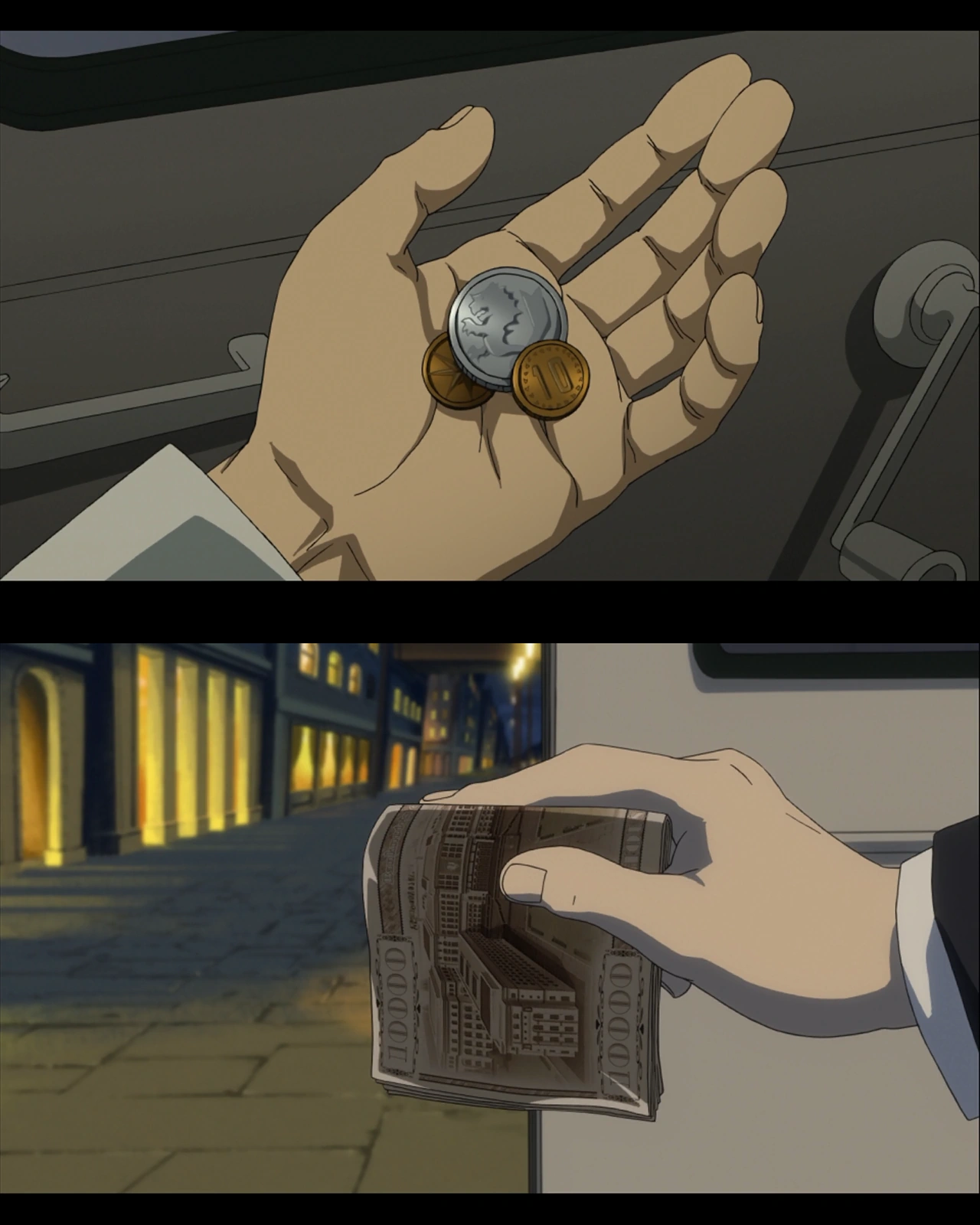 A long-distance call on a pay phone is shown to have costed 520 cens, and a cup of coffee has costed 100 cens. A set of high-quality automail was shown to cost 10 million cens.
