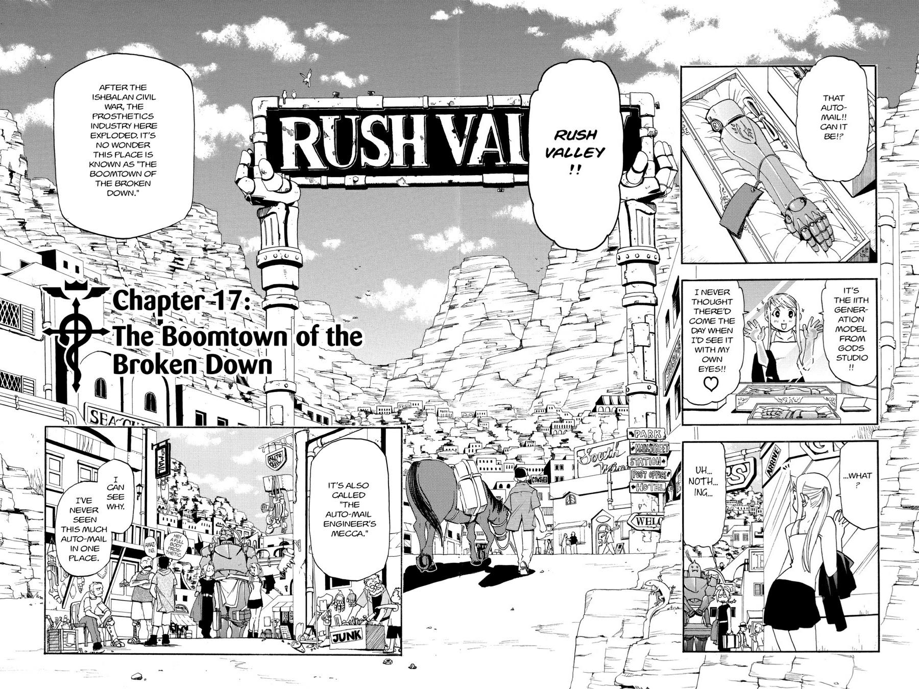 Finally arriving in Rush Valley, Winry marvels at the multitude of automail ateliers lining the streets and explains to the significantly less interested Ed and Al that the violence of the Ishval Civil War and all the skirmishes since has prompted a boom in the prosthetics business centered in this town. However, after Edward's unique arm and leg cause him to be swarmed by Rush Valley's enthusiastic artisans, he discovers that his State Alchemist pocket watch has been stolen in the confusion. Inquiring around town, the trio learns that the most likely culprit is a local pickpocket named Paninya and that they will most likely find her selling her spoils at the Glotz Pawn Shop on the west side of town.