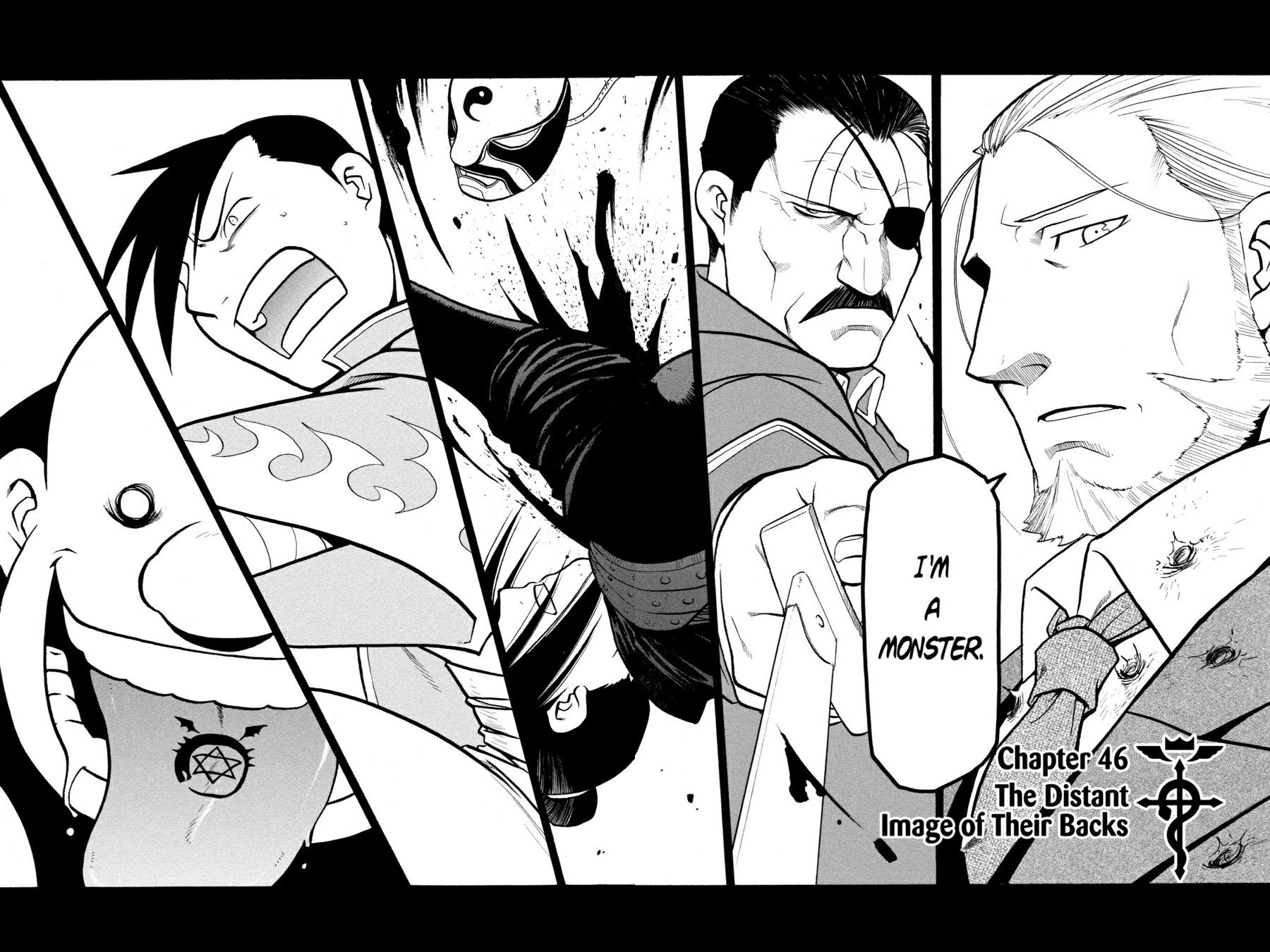 Van Hohenheim rides with several other people in a horse-drawn carriage headed out to the countryside. As he admires the family photo he had taken from Pinako's house, a curious passenger asks him about it and he explains that he had returned home after a long time away only to have an argument with his eldest son, but is confident that they will meet again soon, as they are both alchemists. Suddenly, the carriage is overtaken by a group of bandits, who shoot the driver after he fires a warning flare. When one of the bandits opens the back of the carriage to find all the passengers huddled in terror, Hohenheim speaks out in protest and is promptly fired upon. However, the bandits run off in horror when they discover that their bullets seem to have no lasting effect upon Hohenheim's flesh. As a rescue team arrives to assist, the injured driver explains that the bandits were acting as though they had seen some kind of monster and when the passengers ask Hohenheim how he can possibly be alive with bullet holes in his clothing and eyeglasses, he replies solemnly that that is exactly what he is - a monster.