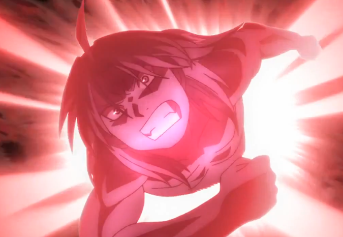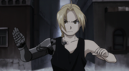 Edward using alchemy without a transmutation circle. Transmuting part of his Automail Arm into a Sword.