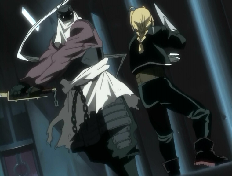 The two guardians of the fifth laboratory unleash a terrible assault on Edward and Alphonse. Once Ed mentions that he spars frequently with someone of a similar constitution, Number 48 reintroduces himself as a former death row inmate - the infamous serial killer known as "Slicer". His suspicions about the lab's proximity to Central Prison seemingly confirmed, Edward begins a new inquiry and reveals to 48 that he is not immortal because he'll die if his blood rune is destroyed and that he now knows where it is. 48 doesn't care since he loves a challenge. Continuing their fight, Ed is having difficulty hitting 48 with his automail sword due to his automail arm malfunctioning, causing Ed to recall what Winry said about it being more fragile due to the lighter weight.