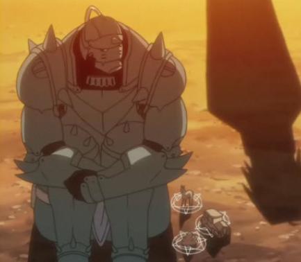 While visiting the grave of Maes Hughes, Winry encounters Sheska. Meanwhile, after the tractor they were using has broken down and then explodes, the Elric brothers must continue their journey on foot to Ishval. Edward, whose hair is messed up from the explosion, complains there is no other way to get there besides walking in the heat. Arriving at a nearby town, he hopes to find a replacement vehicle so they can continue their journey to Ishval. However, Alphonse starts an argument about his brother's impulsive nature and inability to thoroughly plan ahead, as well as their mission to stop Scar. Al is worried that if they stop Scar, it could affect their mission to get their bodies back. When Al states it is better to deal with the homunculi first, it results in a fight between him and Ed, using transmuted objects against each other. Seeing Ed as stubborn, Al complains about it and Ed walks off alone.