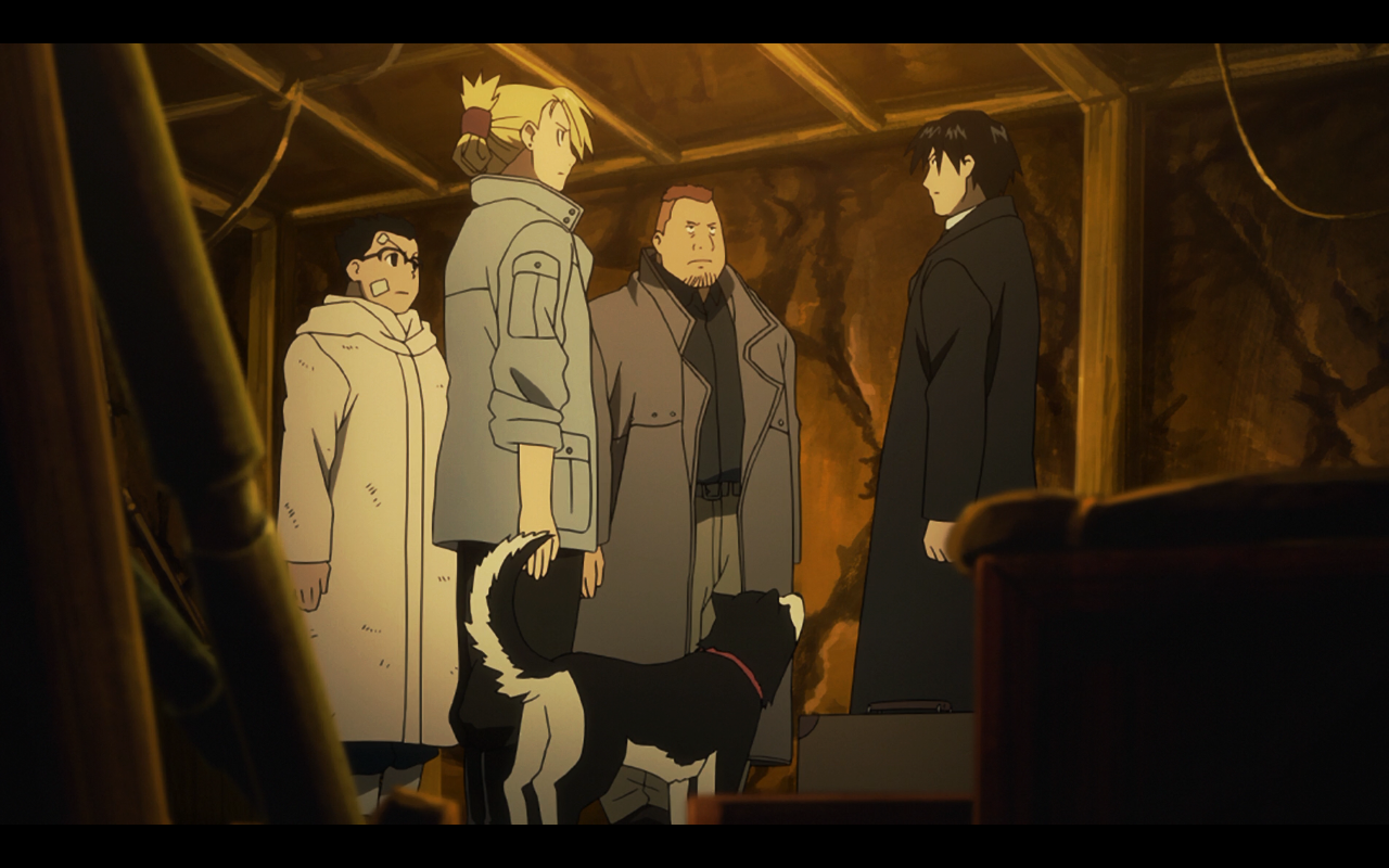 At Central Command, the top brass reveals to Father that Mustang has met up with his former subordinates and that it is likely the train accident involving the Führer as well as the Ishvalans who are heading to Central are connected to this. Father asks what Mustang will do next since they know Mustang a little better than him, which after a few seconds, Major General Armstrong suggests he would kidnap Mrs. Bradley. Father states it is unlikely as she is useless as a hostage. At that moment Mustang's group halts the car Mrs. Bradley is traveling in and after taking down her bodyguards, Mustang states she needs to come with him, promising that she would not get hurt in the process.