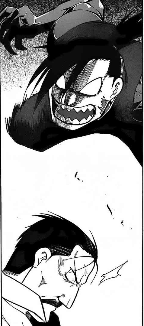 Trying to make sense of this predicament, Edward asks Envy some questions and discovers that Führer Bradley is not, in fact, the one to whom the Homunculi refer as "Father", but rather a Homunculus himself of rank and age inferior even to Envy. Having heard this, Ed deduces that Amestris' recent civil war in the Ishval region must have had some role to play in the Homunculi's plans - a supposition that is confirmed when Envy remarks gleefully that it was he who had started the war by disguising himself as an Amestrian military officer and shooting an Ishvalan child. Enraged to be facing the very cause of a war that had caused so much damage to the country and his own life, Edward lashes out at Envy, but his steely punch doesn't seem to faze the Homunculus one bit. Taking the challenge, Envy declares that he will show the boys something interesting before they die as his body begins to morph and warp. Sensing a familiar change in Envy's energy, Ling advises Ed to back away and mentions that his past skirmishes with the Homunculus suggest that Envy's mass is greatly disproportionate to his size; his true form must be significantly large. And, no sooner have the words left the Xingese prince's mouth that Envy's real body manifests as a huge, eight-legged, human-faced lizard-creature with horns protruding from its hairy back and mutilated, warped human visages screaming cacophonously as they bubble and drip grotesquely from its sides and underbelly.