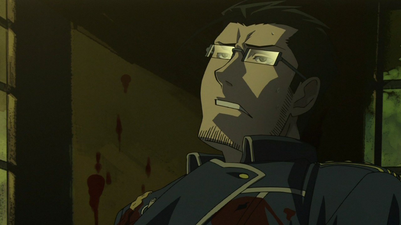 Maes is first introduced to the story in Chapter 6 when he travels from Central City to East City with Major Alex Louis Armstrong in order to officially arrest the errant State Alchemist Shou Tucker for a court-martial in the capital. However, upon arriving on the scene, they discover not only that Tucker, his daughter Nina Tucker, and the guards holding him under house arrest have all been murdered, but also that their deaths fit the modus operandi of an unidentified serial killer who had been targeting State Alchemists back in Central - a man they had codenamed Scar. Informing Roy that Scar has already killed five State Alchemists in the capital and around ten nationwide, Maes advises his friend to lay low and keep safe until the assailant is caught, but when word comes back that Mustang's young protégé, the Fullmetal Alchemist Edward Elric, is currently under attack in town by a man matching Scar's meager description, the Colonel rushes to the scene with his men, Lt. Col. Hughes and Major Alex Louis Armstrong in tow in order to mount a rescue. They arrive in time to save Fullmetal and his younger brother Alphonse Elric from being murdered with the help of Major Armstrong - who happens to be the "Strong Arm Alchemist" - and Mustang's subordinate Lt. Riza Hawkeye, and manage to ascertain a bit more about Scar before his flashy escape: namely that the man is an Ishvalan survivor of the civil war bent on taking vengeance for his slaughtered people. In the aftermath of the skirmish, Hughes issues orders to have a more detailed profile of the fugitive distributed through all official channels and warns Roy to be extra careful with a such a particularly dangerous man after his life.