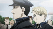 - Despite the antagonism and ribbing he likes to give the Elric brothers (especially Ed) and vice versa, it's shown many times that they do greatly care about and trust each other, such as when he talks down Roy from crossing the line and killing Envy out of sheer hatred and vengeance and symbolically holds Roy to high standards (by refusing to pay back the change he lent him earlier) upon learning of his goals to become Fuhrer and ensuring he doesn't intend end up "walking towards his own death" since he knows that he would likely be considered a war criminal with the reforms that he'd be planning on instituting. Roy, in turn, can even be seen acting as a surrogate father of sorts towards them, generally making a big deal out of ensuring their safety.