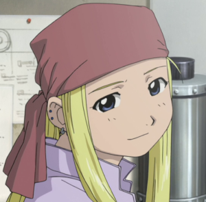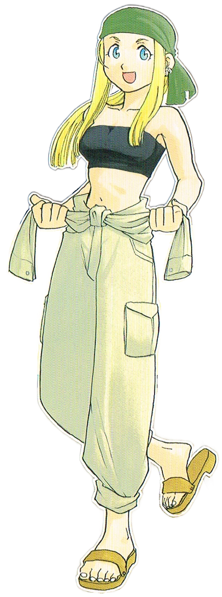 Winry Rockbell (ウィンリィ・ロックベル, Uinrī Rokkuberu) is a main supporting character of the Fullmetal Alchemist series. She is a training surgeon and mechanical repair specialist/enthusiast, the daughter of Yuriy Rockbell and Sarah Rockbell (two surgeons that worked on the Ishval Civil War), the granddaughter of Pinako Rockbell (a well known mechanic and surgeon in her youth) and the close childhood friend of Edward Elric and Alphonse Elric from Resembool who supports Edward as his personal automail engineer and mechanic, making sure his prosthetic right arm and left leg are always in good working order.